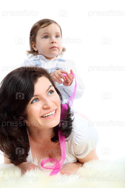 Маленькая девочка с розовым луком сидит на матери, которая лежит на белом пушистом