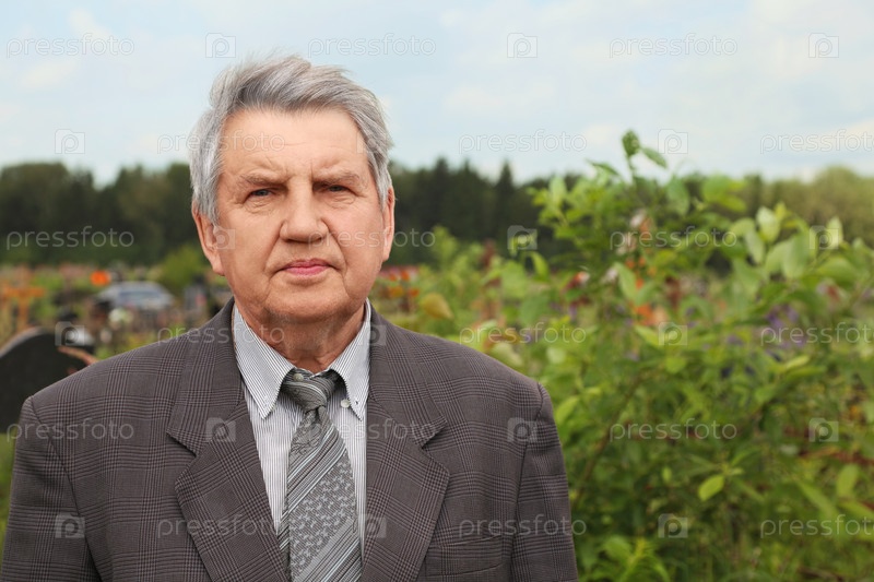 Старый серьезный старший в сером костюме стоит на кладбище, глядя