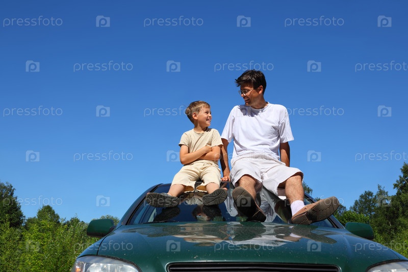 Два человека сидят на вершине зеленой машины под ясным голубым небом