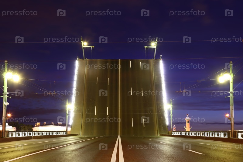 Ночной вид на поднятый мост в Санкт-Петербурге, Россия