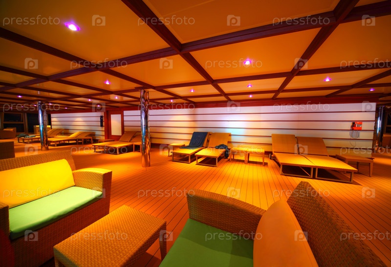 Интерьер освещенного зала на палубе круизного лайнера ночью