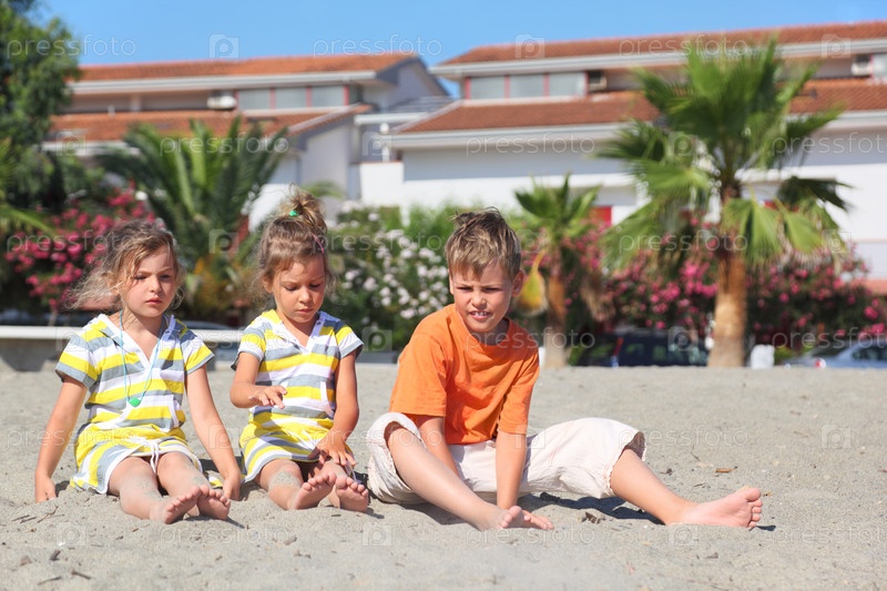 Трое детей сидят на песчаном пляже