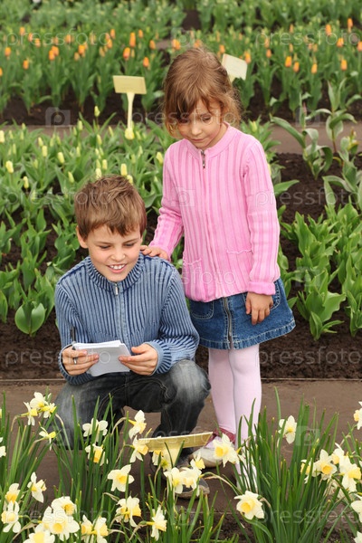 Маленький мальчик и девочка смотрят на нарцисса в теплице, парень пишет