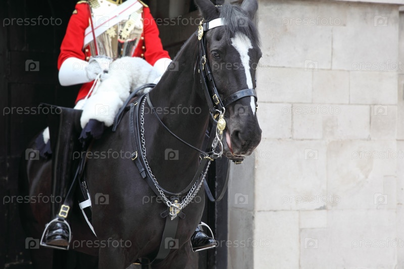 ЛОНДОН - 7 ИЮНЯ: Черный конь под гвардейцем в красном пальто и черном