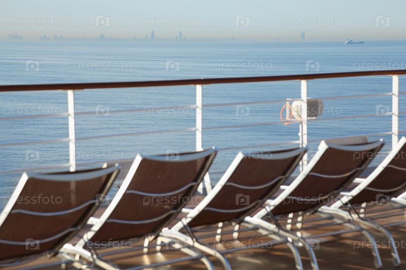 Ряд длинных кресел на палубе круизного лайнера в нефокусном состоянии. берег