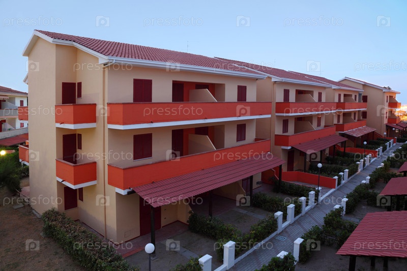 Розоватое здание с красной черепичной крышей и балконами