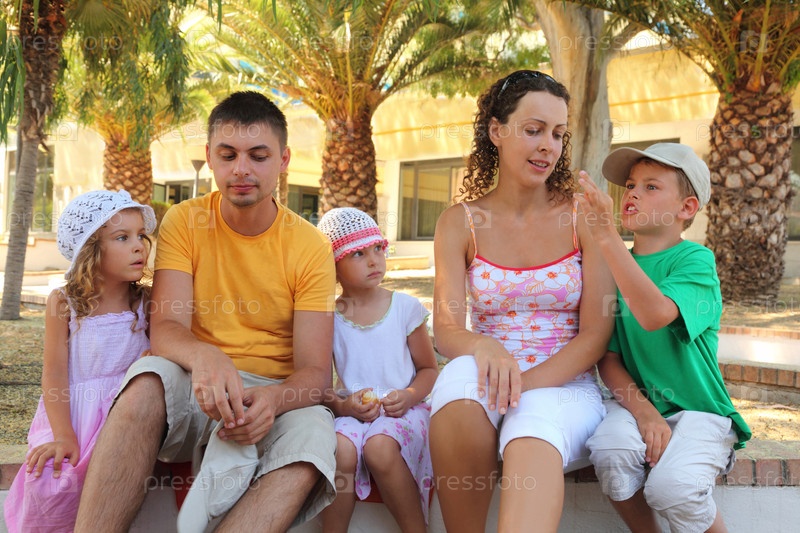 Отец, мать и две дочери слушают историю мальчика. лето,
