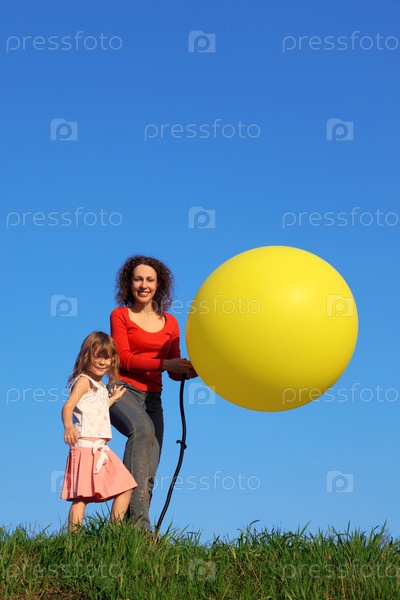 Мать и дочь стоят на лугу с зеленой травой против голубого неба,