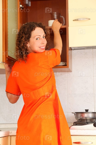 Женщина в оранжевом платье тянется к кухонной полке