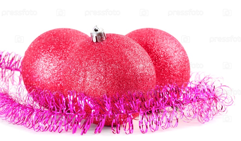 Три красных шарика на рождественской елке, окруженные фиолетовым брезентом, сосредоточьтесь на