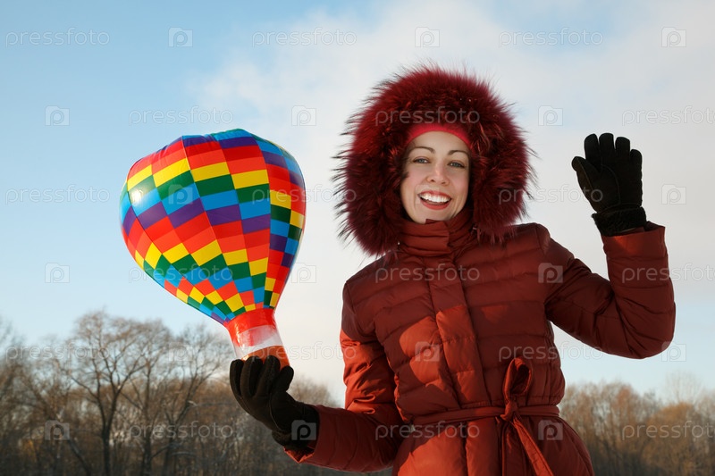 Женщина улыбается, размахивая красочным воздушным шаром