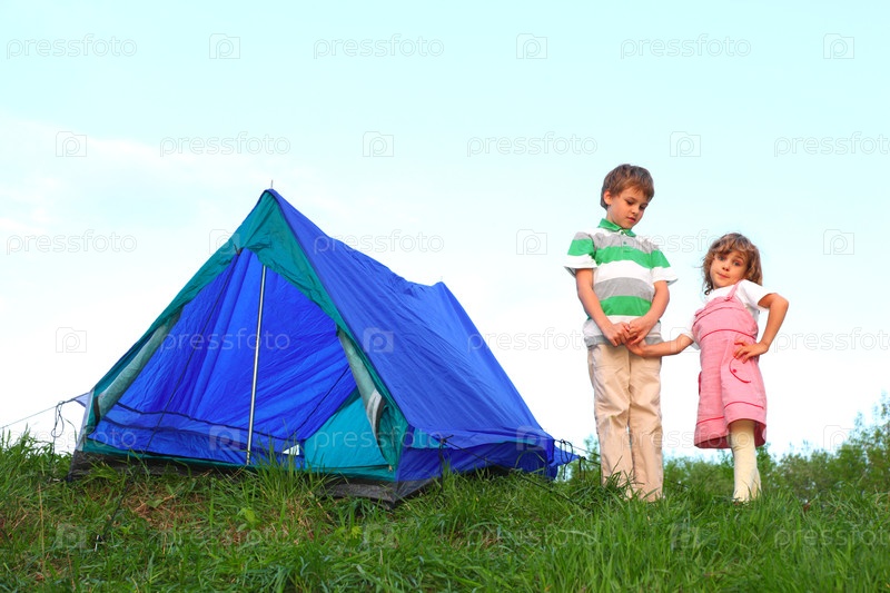 На природе, возле палатки, маленький мальчик держит красивую девушку