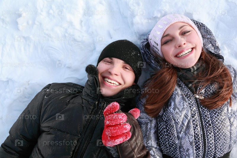 Два человека смеются, лежа в снегу