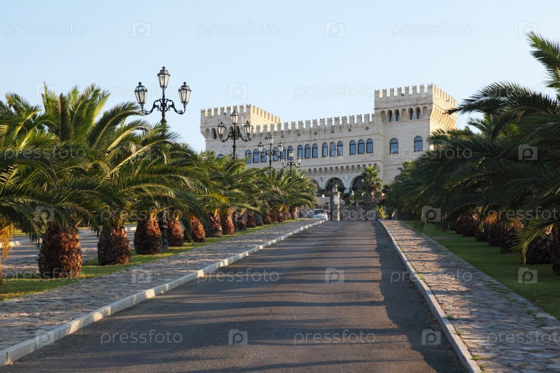 Широкая дорога, которая ведет в дворец с башнями, статуями и