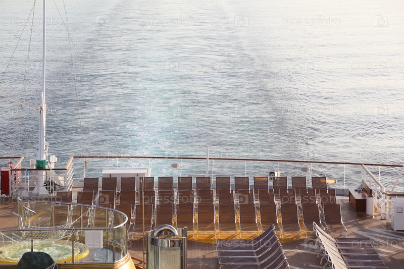 Много chaise longues на палубе круизного лайнера. золотое утреннее солнце светит