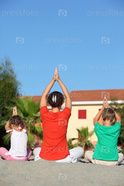 Женщина с двумя детьми сидит спиной на песке в позе йоги и