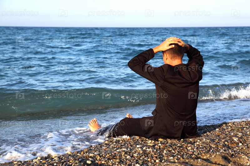 Бедный босоногий мужчина в костюме сидит на каменном берегу и протягивает руку