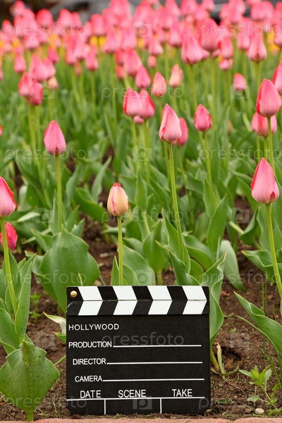Черно-белая кинотеатральная доска на полу среди розового поля