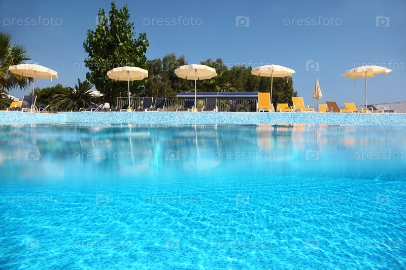 Бассейн находится под открытым небом, на границе которого выложены инкрустированные плитки