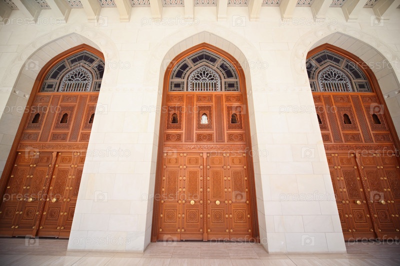ОМАН - 13 апреля 2010 года: три двери здания внутри Великой мечети в
