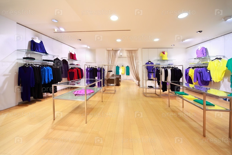 Ярко освещенный магазин одежды с красочными дисплеями одежды