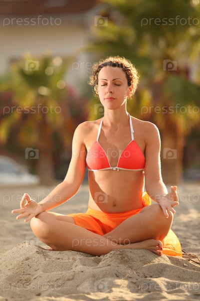 Молодая женщина в оранжевом бикини сидит на пляже в лотосной позе с