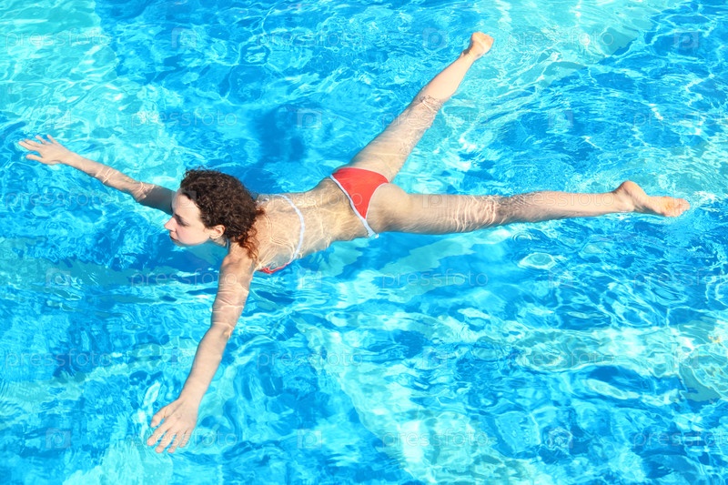 Женщина плавает спокойно в искрящейся синей воде бассейна
