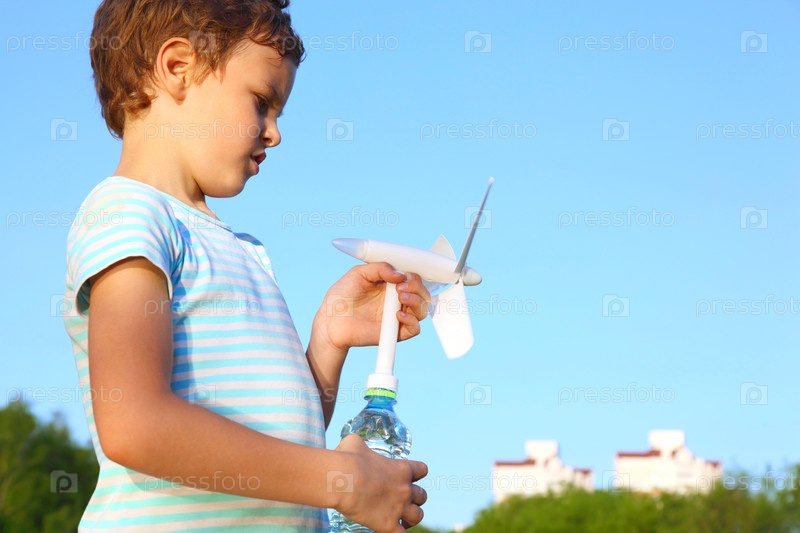Маленький мальчик против голубого неба играет с ветровым генератором