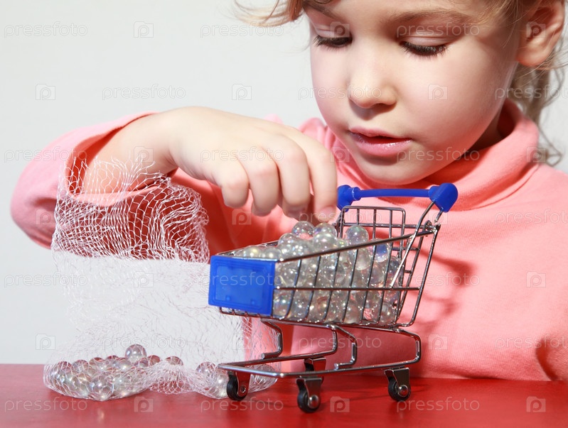 Милая маленькая девочка заботливо играет с игрушечной тележкой, заполненной небольшими
