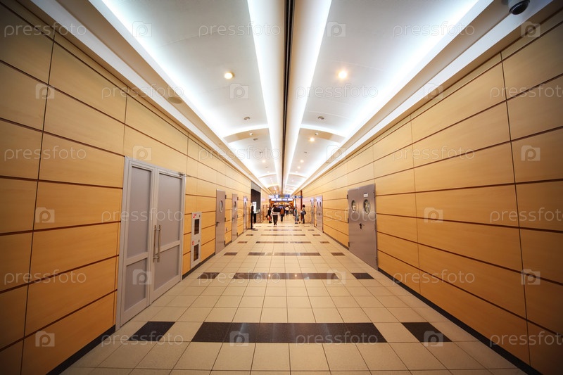 Люди идут по длинному, оранжевому коридору в аэропорту