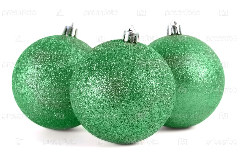 Близкий снимок трех зеленых шаров на рождественской елке, изолированных от белого