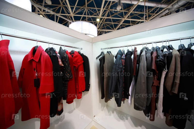 Плащи аккуратно висят на стеллажах в ярком торговом помещении
