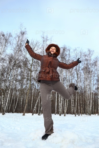 Женщина стоит на снегу и гравитирует к небу, прямые руки и один