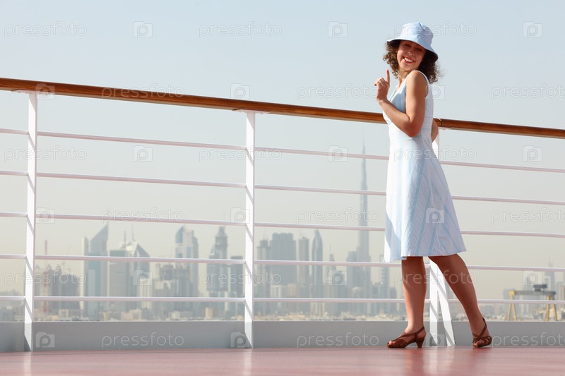 Молодая красота брюнетка женщина стоит на палубе круизного лайнера, город на