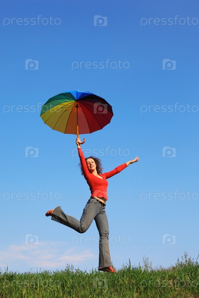Девушка прыгает по зеленой траве с цветным зонтиком в руке