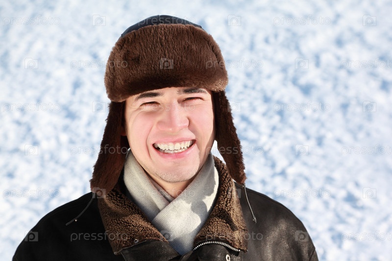 Мужчина широко улыбается в заснеженной наружной обстановке