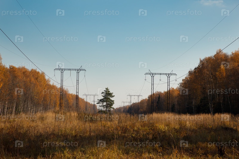 Электрическая линия в осеннем лесу. количество опор или коктейля