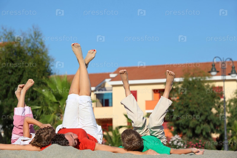 Девочка и мальчик с матерью лежат спиной на песке, поднятыми ногами