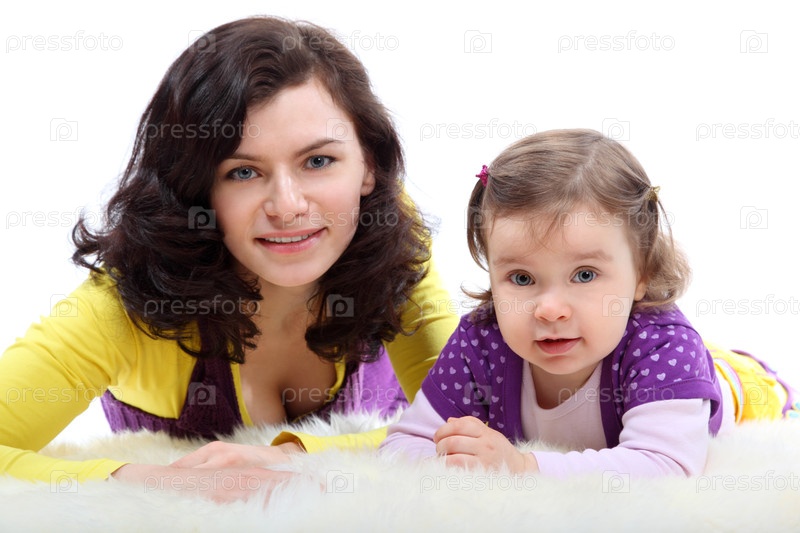 Счастливая мать в цветных одеждах со смеющейся дочерью на белом
