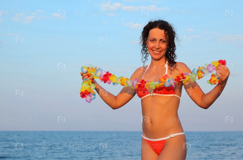 Молодая женщина, одетая в купальный костюм и держащая гирлянду красоты