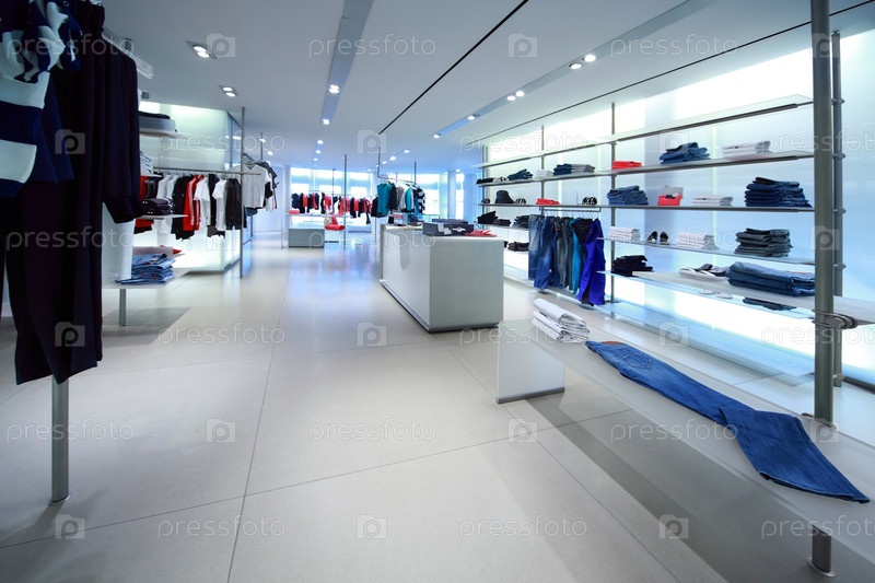 Современный магазин одежды с чистым, ярким интерьером