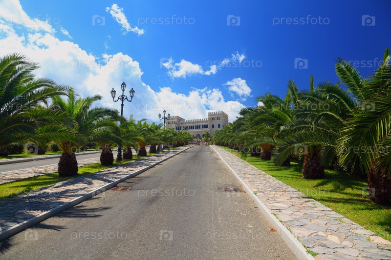 Пальмы посажены в ряд вдоль торгового центра, ведущего к древнему белому замку