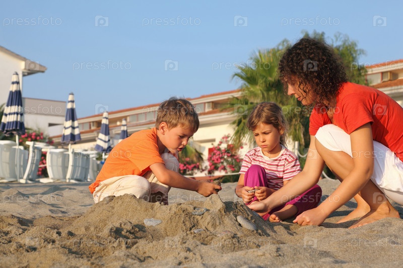 Мать с двумя детьми сидит на пляже днем и строит холм