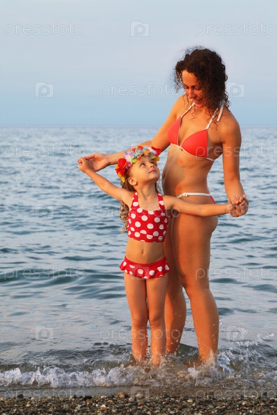 Мать и маленькая дочь стоят на пляже. на голове молодой девочки