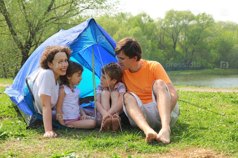 Семья отдыхает возле голубой палатки в зеленой траве