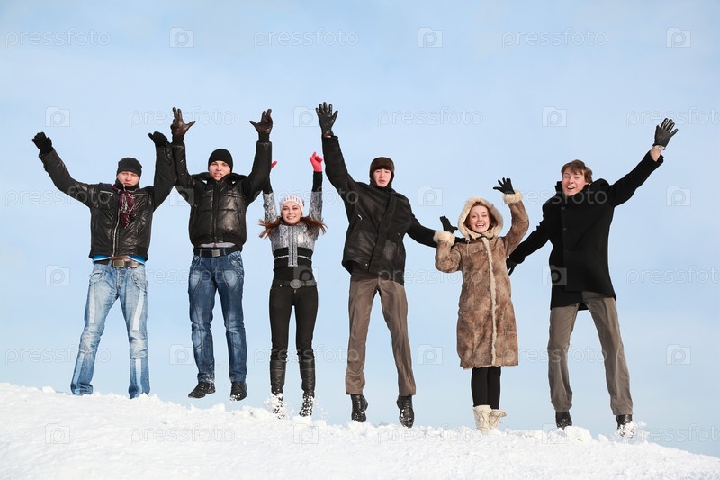 Шесть человек радостно позируют на снежном холме