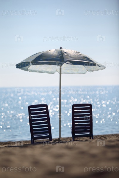 Рядом с берегом моря два темно-синих пластиковых стула остаются под большим
