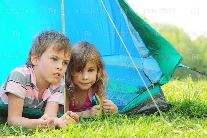 Два ребенка лежат на траве возле палатки
