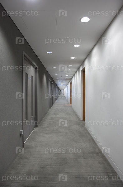 Длинный, чистый коридор с ковровым полом и углубленным освещением