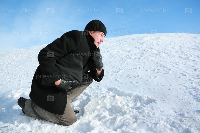 Молодежь, опирающаяся на одно колено на снег гравитации вперед и держит короткий